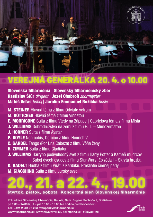 Aprílové koncerty Filmovej hudby uvedie Slovenská filharmónia tradične pod taktovkou Rastislava Štúra vo štvrtok, piatok a v sobotu 20., 21. a 22. apríla o 19.00. Po prvýkrát sa v populárnom programe predstaví s orchestrom aj Slovenský filharmonický zbor /zbormajster Jozef Chabroň/. Pre veľký zá...