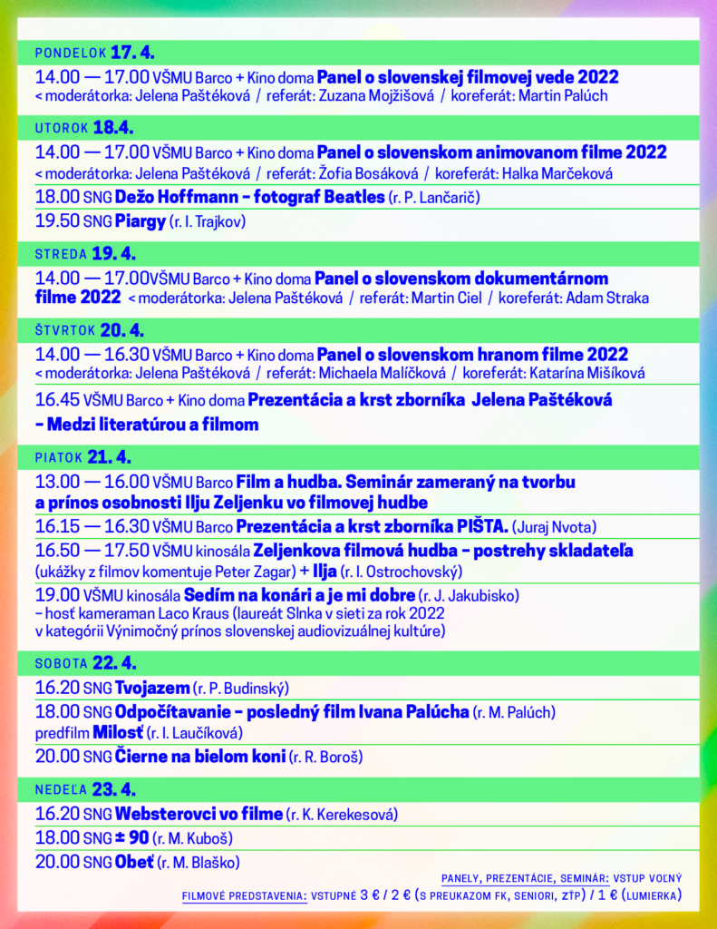 Sprievodný program prehliadky tvoria tradičné panelové diskusie o hranom, dokumentárnom a animovanom filme a o filmovej vede, ktoré bude viesť filmová a literárna historička Jelena Paštéková. Uskutoční sa aj interdisciplinárny seminár Film a hudba, zameraný na tvorbu a prínos osobnosti Ilju Zeljenku vo filmovej hudbe. Súčasťou programu bude aj komentované pásmo nazvané Zeljenkova filmová hudba – postrehy skladateľa, počas ktorého bude ukážky z filmov komentovať hudobný skladateľ Peter Zagar. Počas tohto stretnutia sa premietne aj dokument Ilja (2010) režiséra Ivana Ostrochovského, ktorý zachytáva posledné obdobie Zeljenkovho života, poznačené smrteľnou chorobou. Program doplní prezentácia a krst zborníka z vlaňajšieho interdisciplinárneho seminára o tvorbe Petra Pišťanka.