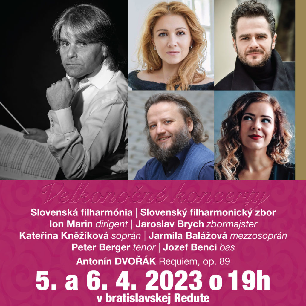 V stredu a vo štvrtok 5. a 6. apríla vystúpia v Koncertnej sieni Slovenskej filharmónie orchester Slovenská filharmónia, Slovenský filharmonický zbor (zbormajster Jaroslav Brych) a česko-slovenské kvarteto sólistov - Kateřina Kněžíková soprán, Jarmila Balážová mezzosoprán, Peter Berger tenor a Jozef Benci bas. V naštudovaní rumunsko-rakúskeho dirigenta Iona Marina zaznie v bratislavskej Redute Rekviem Antonína Dvořáka. Ion Marin vedie popredné svetové orchestre, pod jeho taktovkou spievali hviezdy opery ako Luciano Pavarotti či Plácido Domingo.