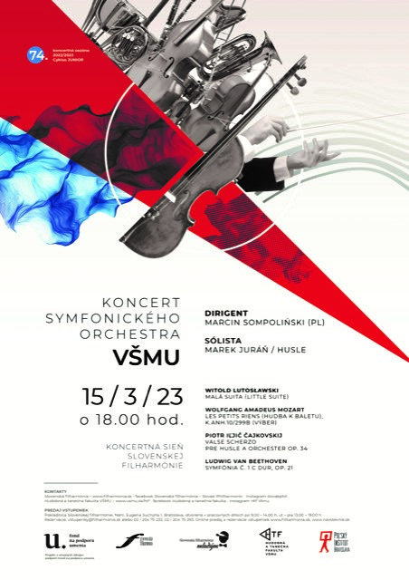 Na záver zaznie v interpretácii Symfonického orchestra Vysokej školy múzických umení Beethovenova Symfónia č. 1 C dur, op. 21. Skladateľ dedikoval dielo svojmu mecenášovi barónovi Gottfriedovi van Swietenovi, známemu podporovateľovi Haydna a Mozarta. Pestrý hudobný program interpretovaný mladými umelcami zaznie v naštudovaní Marcina Sompolińského, jedného z priekopníkov štýlovej interpretácie hudby v Poľsku. Ako dirigent účinkoval vo väčšine európskych krajín a Japonsku, v prestížnych koncertných sálach. Bol šéfdirigentom orchestrov Veľkého a Hudobného divadla v Poznani a viedol súbor pre starú hudbu Musicae Antiquae Collegium Varsoviense Varšavskej komornej opery, kde dirigoval viacero opier. Už 30 rokov pôsobí na Hudobnej akadémii v Poznani ako profesor orchestrálneho dirigovania. Marcin Sompoliński je tiež autorom inovatívneho formátu „Speaking Concerts“. Ide o sériu koncertov pre milovníkov hudby. Spolupráca poslucháčov HTF-VŠMU so skúseným, medzinárodne uznávaným dirigentom je pre mladých umelcov inšpiráciou a nenahraditeľnou skúsenosťou v ich orchestrálnych zručnostiach. Koncert sa koná na základe dlhoročnej spolupráce medzi Slovenskou filharmóniou a Vysokou školou múzických umení v Bratislave. Začne sa o 18-tej.