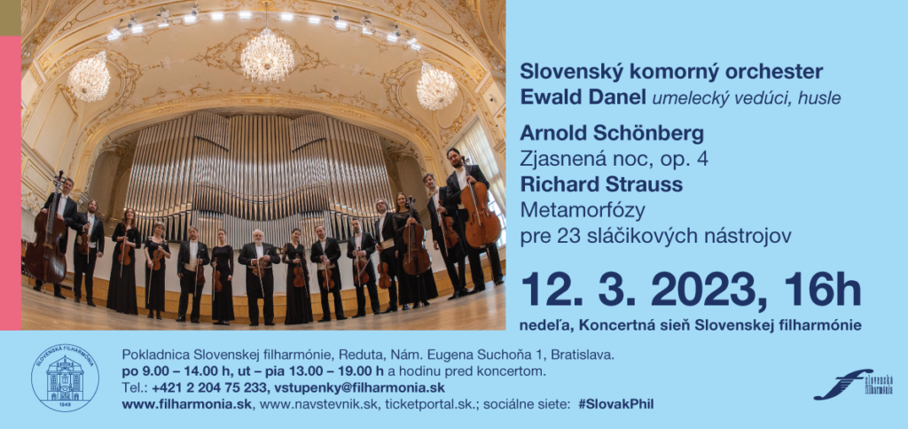 Šiesty koncert cyklu Slovenského komorného orchestra sa uskutoční v Koncertnej sieni Slovenskej filharmónie v nedeľu 12. marca 2023 o 16-tej. Na úvod nedeľného popoludnia, 12. 3. 2023, v Koncertnej sieni Slovenskej filharmónie zaznie Zjasnená noc Arnolda Schönberga. Pôvodné dielo pre sláčikové sext...