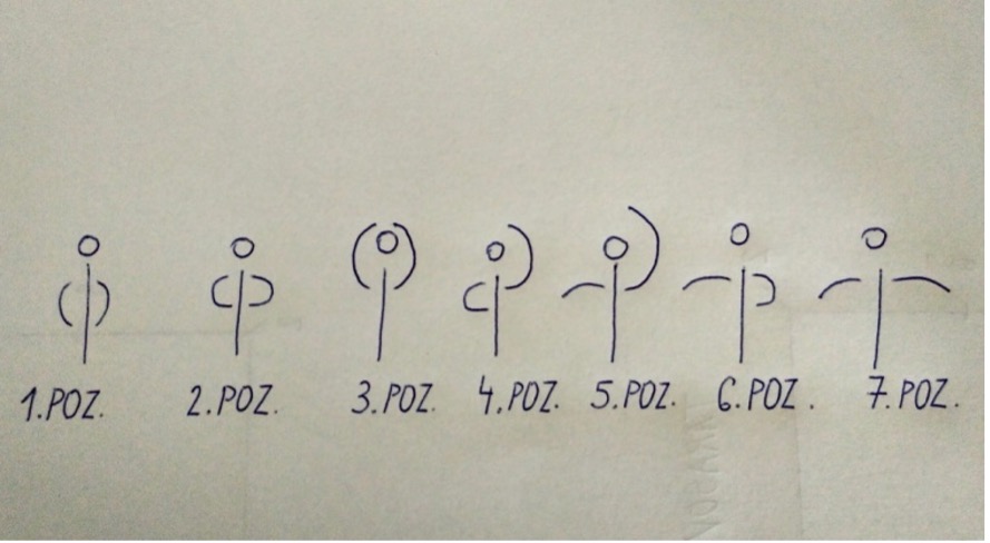 - v V. pozícii sú dolná končatina, ktorá stojí vpredu a s ňou súhlasný bok a plece, od diváka (zrkadla a p.) vzdialenejšie