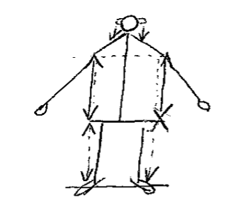 Pri správnom držaní tela zviera brada s krkom pravý uhol, plecia sú kolmo nad bokmi (vytvárajú tzv. akademický obdĺžnik), váha tela je sústredená nad prednou časťou chodidiel, päty sú odľahčené, chodidlá sa dotýkajú podložky tromi bodmi: pätou, palcom a malíčkom. Lýtka zvierajú s chodidlami ostrý uhol, prípadne pravý uhol, vtedy sa váha sústredí správne nad prednými časťami chodidiel. Keby zvierali tupý uhol, preniesla by sa váha tela nad päty. V takom postoji je ťažké udržať rovnováhu (najmä v postoji na jednej nohe), okrem toho sa tlakom váhy tela na päty znižuje klenba nohy.