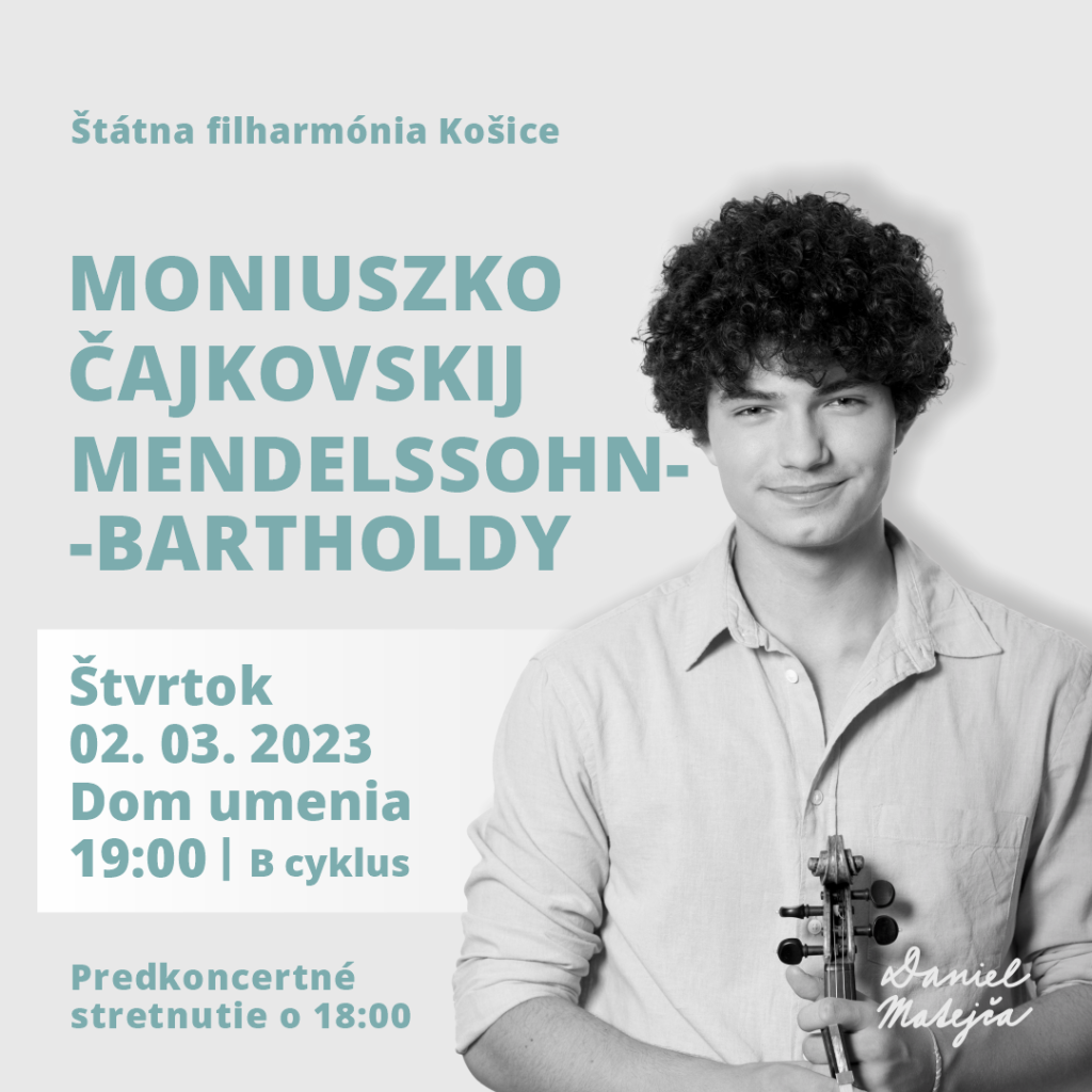 Prvý marcový koncert Štátnej filharmónie Košice s názvom MONIUSZKO – ČAJKOVSKIJ – MENDELSSOHN-BARTHOLDY láka návštevníkov atraktívnym programom aj obsadením. V Čajkovského husľovom koncerte sa vo štvrtok 2. marca o 19:00 na pódiu Domu umenia predstaví Daniel Matejča, víťaz televíznej šou Virtuosos...