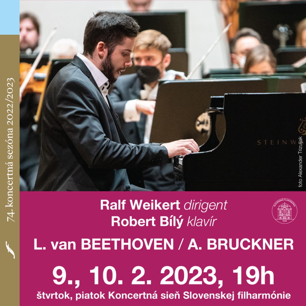 Vo štvrtok a piatok 9. a 10. februára 2023 sa Robert Bílý predstaví po boku orchestra Slovenská filharmónia. V jeho interpretácii zaznie Beethovenov Koncert pre klavír a orchester č. 1 C dur, op. 15. Skladateľove prvé dva klavírne koncerty vznikali v rokoch 1787-1789. Beethoven ich počas nasledujúcich rokov prepracovával. Ako prvý bol vydaný Koncert C dur, Beethoven však pred ním skomponoval koncert B dur, ktorý poznáme dnes v poradí ako druhý. Koncert pre klavír a orchester č. 1 C dur, op. 15 mal svoju premiéru v roku 1795 pod taktovkou Josepha Haydna. Zaznel v interpretácii Ludwiga van Beethovena. Nasledovať bude jedna z najpopulárnejších Bruckenrových symfónií - Symfónia č. 4 Es dur Romantická, WAB 104. Skladateľ ju skomponoval v roku 1874, viackrát ju prepracovával. V premiére ju uviedli v roku 1881 Viedenskí filharmonici. Program koncertu zaznie v naštudovaní rakúskeho dirigenta Ralfa Weikerta, ktorý študoval na Bruckenrovom konzervatóriu v Linzi u legendárneho Hansa Swarowského. Bratislavskému publiku sa predstaví takmer presne po troch rokoch.
