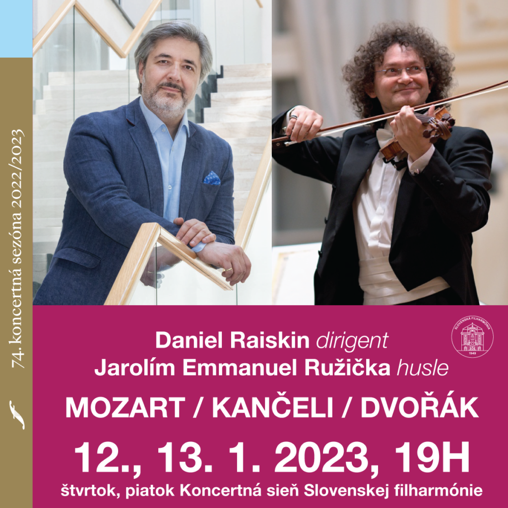 Slovenská filharmónia sa na úvodnej januárovej dvojici koncertov, vo štvrtok a piatok 12. a 13. januára 2023, predstaví so šéfdirigentom Danielom Raiskinom. Sólistom večerov bude prvý koncertný majster Jarolím Emmanuel Ružička. V Koncertnej sieni zaznejú diela Wolfganga Amadea Mozarta, Giju Kančeli...