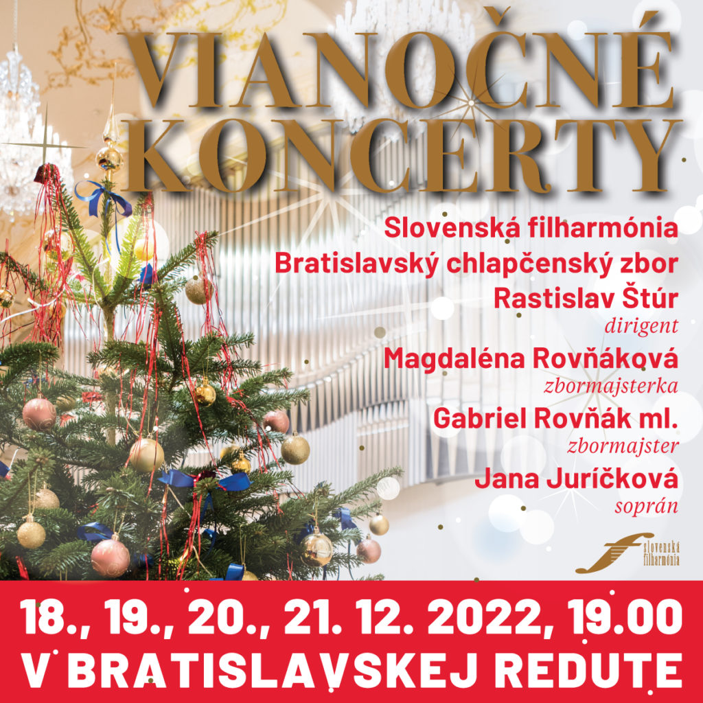 Vianočné koncerty Slovenskej filharmónie sa uskutočnia v nedeľu, pondelok, utorok a v stredu 18., 19., 20. a 21. 12. 2022. Pre veľký záujem sme v nedeľu pridali verejnú generálku, ktorá sa začne o 10.00.