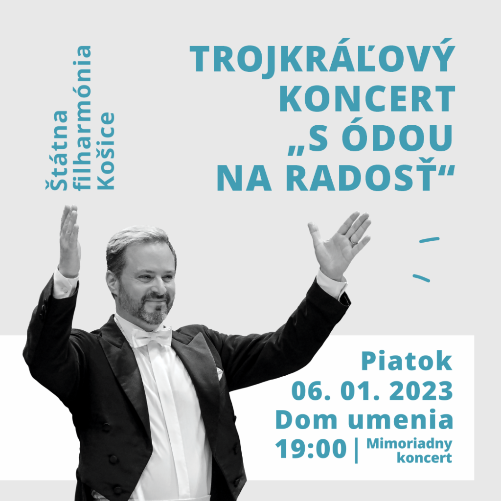 Mimoriadny TROJKRÁĽOVÝ KONCERT "S ÓDOU NA RADOSŤ" sa uskutoční v piatok 6. januára 2023 o 19:00 v Dome umenia. Cena vstupného je 16/15/14 €, zľavnené: 13/12/11 €, lóža: 20 €. Vstupenky na podujatia Štátnej filharmónie Košice sú v predaji aj so zľavami vo vstupenkovej pokladnici Domu umenia od pondelka do štvrtka (10:00 – 12:00, 14:00 – 17:00) a hodinu pred podujatím. Vstupenky sú v predaji aj online na webe Štátnej filharmónie Košice alebo cez link https://program-sfk.colosseum.eu/. ŠFK spustila predaj vstupeniek na svoje koncerty cez nový predajný systém, pričom zľavy je už možné uplatniť aj pri online nákupe.