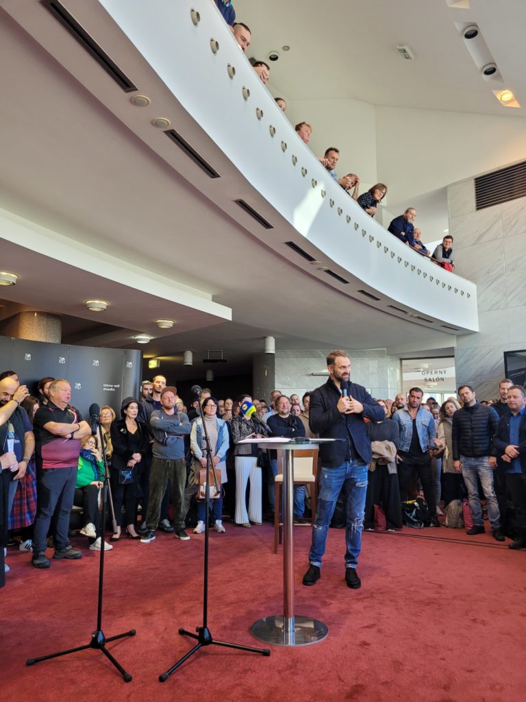 Ekonomický riaditeľ menoval všetky úspechy, ktoré sa (ešte stále) aktuálnemu vedeniu podarili. Následne vystúpil aj herec Tomáš Maštalír, ktorý vyjadril podporu odchádzajúcemu šéfovi našej prvej scény a vyzval ministerku kultúry, aby svoje rozhodnutie zvrátila."K ozdravovaniu inštitúcie reálne prichádzalo a týmto krokom sa dá predpokladať, že sa to zastaví. Kvôli nešťastnej, malichernej ľudskej chybe, ktorá nie je procesnou chybou, kvôli nešťastnému výroku, ktorých je politický priestor preplnený, tak máme exemplárny prípad, že odvolávame štatutára inštitúcie. Pani ministerka kultúry, máme silný pocit, že Vám je to možno jedno, či táto inštitúcia naozaj funguje, či funguje dobre alebo zle. Či sa naštartoval ozdravný proces, alebo nie. Máme silný proces, že je Vám to jedno. Stojíme za týmto vedením a vyzývame Vás, aby ste to rozhodnutie zvrátili a ponechali národnému divadlu odvolané vedenie," povedal Maštalír.