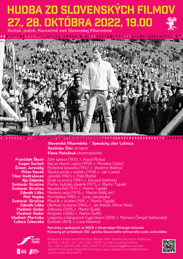 Slovenská filharmónia má každoročne v ponuke koncerty svetovej filmovej hudby. V novej 74. sezóne ju rozšírila o dva koncerty mapujúce hudbu zo slovenských filmov, česko-slovenských skladateľov. Uskutočnia sa vo štvrtok a piatok 27. a 28. októbra 2022 o 19.00 v Koncertnej sieni Slovenskej filharm...