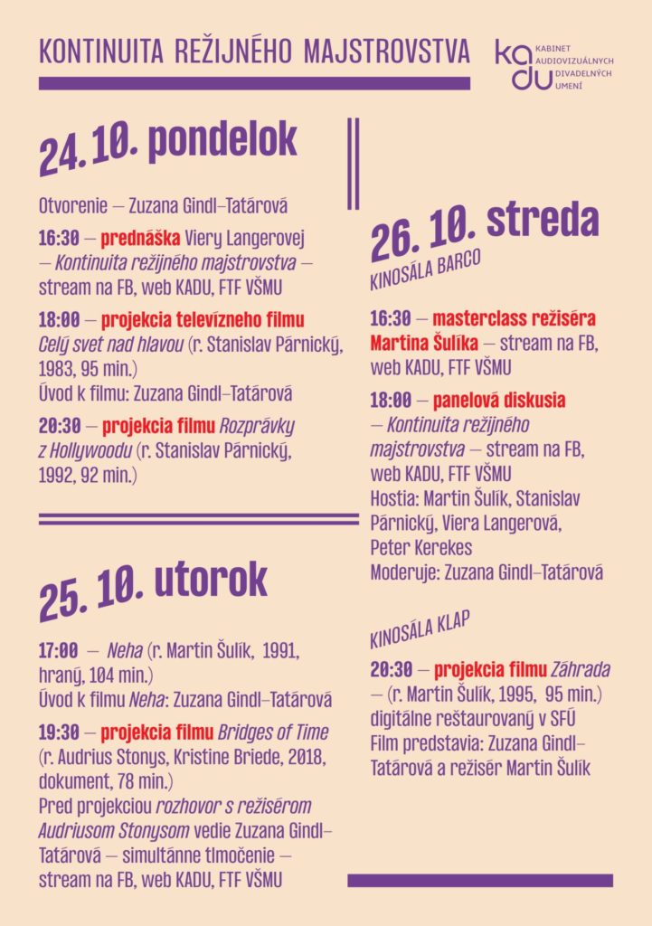 Panelovej diskusie na tému kontinuity režijného majstrovstva sa okrem Martina Šulíka a Stanislava Párnického zúčastní aj ďalší Párnického žiak – dokumentarista a producent Peter Kerekes, ktorému podľa Gindl-Tatárovej „Párnický vytvoril špeciálny priestor vyhovujúci jeho režijnému naturelu. Stal sa dokumentaristom, ktorý sa cez výraznú štylizáciu vrátil k hranej réžii“. Diskutovať bude aj filmová publicistka Viera Langerová, tá na seminári bude mať aj prednášku o tvorbe oboch režisérov s presahom do európskej kinematografie. Debatu bude moderovať Zuzana Gindl-Tatárová s dôrazom na tesné prepojenie filmovej, televíznej i divadelnej réžie na naše súčasné bytie a jej etický rozmer. Seminár ponúkne tiež projekcie filmov Celý svet nad hlavou (1983) a Rozprávky z Hollywoodu (1992) Stanislava Párnického a Neha (1991) a Záhrada (1995) Martina Šulíka.