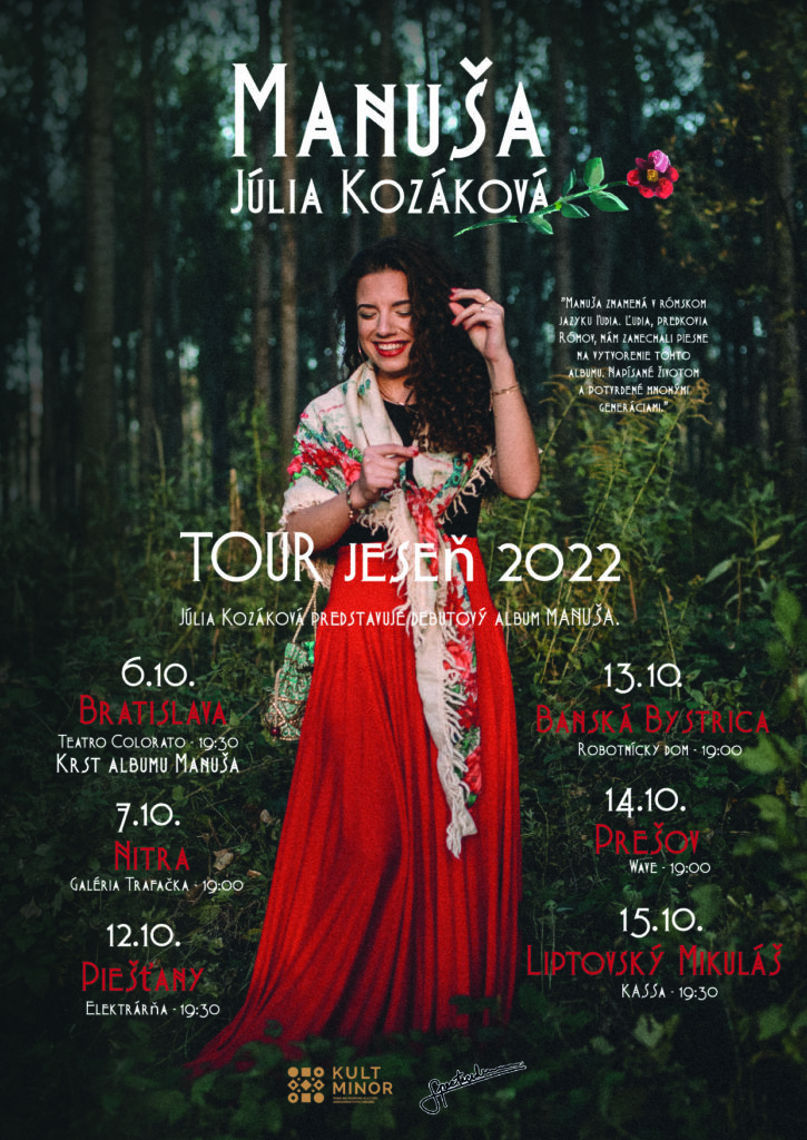 Talentovaná hudobníčka Júlia Kozáková predstaví publiku počas živých koncertov svoj nedávno vydaný debut Manuša, ktorý sleduje tradičné staré rómske piesne a ich príbehy zo Slovenska a strednej Európy. Jej hlas bude doprevádzať tradičná cimbalovka v zložení z jedných z najuznávanejších rómskych hudobníkov zo Slovenska. Piesne z albumu sú kľúčovou súčasťou Rómov a ich kultúrnej identity. Júlia je world music speváčka a nedávno dokončila štúdium hudby na SOAS University of London. Spolupracuje s Rómami na Slovensku, aby v rámci tejto tradície rozvíjala autentický hlas. Jej vokálny štýl možno opísať ako pohlcujúci a empatický a jej výkon ako skutočne autentický. Mužskú posilu v kapele budú tvoriť Viliam Didiáš na husle, Ľubomír Gašpar na cimbal, violista Vojtech “Bélu” Botoš a kontrabasista Ján Rigo. Počas krstu CD v Bratislave a koncertu v Piešťanoch zostavu hudobníkov obohatí Zsolt Varady na gitaru.