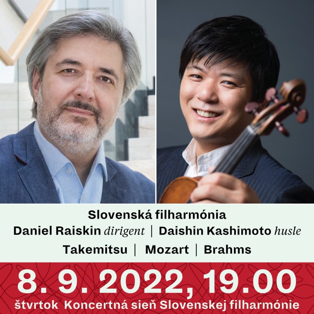 Slovenská filharmónia, japonský husľový virtuóz Daishin Kashimoto a šéfdirigent Daniel Raiskin