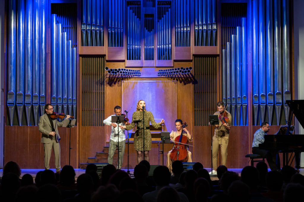 Ako hostia prijali pozvanie na koncert speváčka Barbora Švidraňová a klavírny virtuóz Matej Arendárik. Herečka a speváčka Barbora Švidraňová je rodáčkou zo Žiliny, dočkala sa preto vrúcneho privítania. V prvom rade treba podotknúť, že je to typ interpretky, ktorá je osobitá nielen farbou vokálu, ale i výzorom. Je krásna, no nie je ten typ tuctovo krásnej ženy a na pódiu okamžite vynikne svojím zjavom i charizmou. Má nezameniteľný typ energie, ktorý sa s hlboko posadeným, nosným vokálom a pevne posadenými výškami perfektne snúbi. Nie každá speváčka si trúfne na bondovku Skyfall – navyše, spievať niečo po Adele je vždy výzva výrazovo i rozsahom. Švidraňová preukázala zmysel pre dramatično: začala pieseň v pianissime, aby potom patrične mohla tému vygradovať. S hlasom dokáže pracovať nádherne, napokon, jej sýty vokál a prekrásne hlboké polohy sú pre túto pieseň priam predurčené. Osudovou piesňou dokázala zaplniť celú sálu.