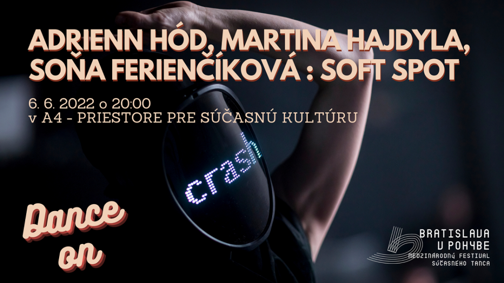 V pondelok 6. júna 2022 môžu návštevníci/návštevníčky DANCE ON vidieť slovenskú premiéru experimentálneho fyzického diela zrodeného v spolupráci slovenských tanečníc Martiny Hajdyly, Sone Ferienčíkovej a maďarskej choreografky Adrienn Hód SOFT SPOT. Prostredníctvom improvizácie a výskumu fyzického tela skúmajú vzťah medzi telom, osobnosťou a významom. Čo nám hovorí tvár, gesto, postavenie a pohyb tela? Ako komunikujeme prostredníctvom tela s ostatnými? SOFT SPOT hravo skúma ľudské vlastnosti, pýta sa, čo nás ako ľudí definuje a obzerá sa po skrytom citlivom „mäkkom mieste” vo vnútri nás samotných.