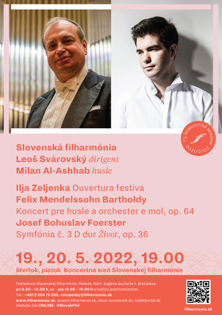 Symfonické koncerty Slovenskej filharmónie pokračujú vo štvrtok a piatok 19. a 20. mája 2022. Hosťami budú dvaja českí umelci – dirigent Leoš Svárovský a mladý husľový virtuóz Milan Al-Ashhab, rodák z Jeruzalema, ktorý od svojich piatich rokov žije v Čechách. Na koncertoch zaznejú diela Ilju Zeljen...
