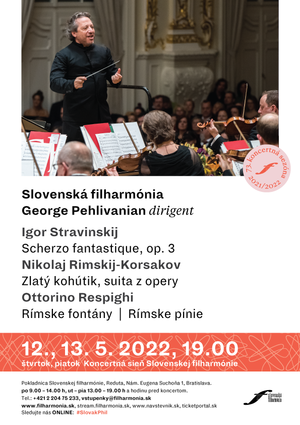 Slovenská filharmónia sa vo štvrtok a piatok 12. a 13. mája predstaví pod taktovkou pravidelného hosťa sezón, francúzsko-amerického dirigenta Georgea Pehlivaniana. Spoločne uvedú lákavý symfonický program zostavený z diel Igora Stravinského, Nikolaja Rimského-Korsakova a Ottorina Respighiho. Konce...