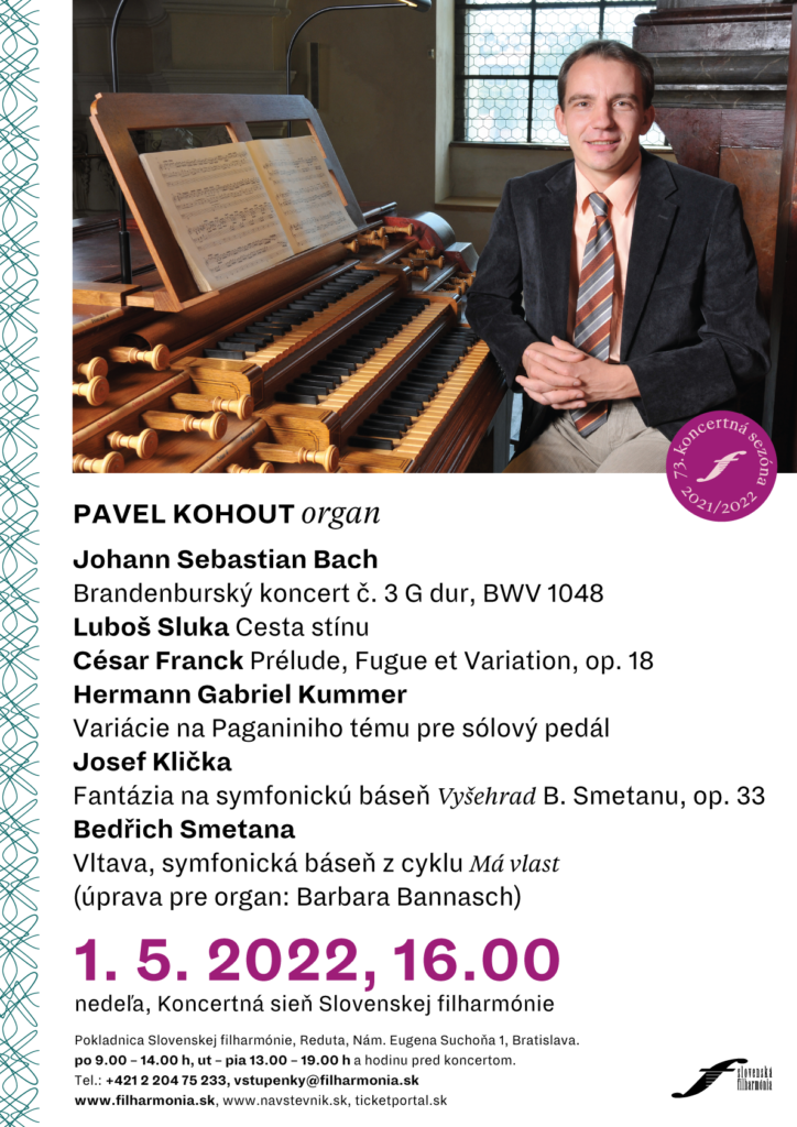 Na úvod koncertu zaznie Bachov tretí zo šiestich Brandenburských koncertov, ktoré skladateľ skomponoval pre markgrófa Christiana Ludwiga počas svojho pôsobenia na dvore v Köthene. Nasledovať bude skladba českého autora Luboša Sluku Cesta stínu z cyklu Cesty pre sólový organ. César Franck napísal pre trojmanuálový organ z baziliky Sainte-Clotilde v Paríži väčšinu svojich diel. Jedno z jeho najznámejších diel opus 18 je na programe v Koncertnej sieni SF. Nasledovať budú Variácie na Paganiniho tému pre sólový pedál Hermanna Gabriela Kummera, ktorý sa pri písaní inšpiroval Paganiniho husľovým Capriciom č. 24. Predposlednou skladbou nedeľného popoludnia bude doposiaľ najhrávanejšie dielo skladateľa a organistu Josefa Klička - Fantázia na symfonickú báseň Vyšehrad v roku 1886. Koncert uzavrie úprava druhej symfonickej básne Vltava z cyklu Má vlast Bedřicha Smetanu.
