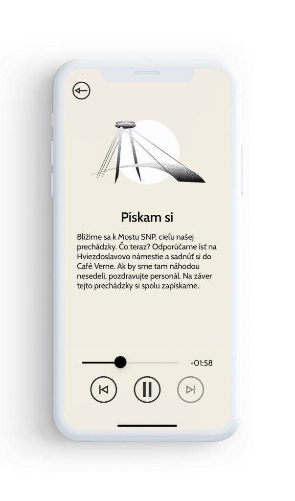 Okrem zvuku sa môžete orientovať aj pomocou mapy - otočením telefónu do horizontálnej polohy sa zobrazí schematická mapa celej trasy. Tá sa začína na Jamnického ulici na Dlhých Dieloch. Kľukatým zjazdom vedie cez Matejkovu ulicu k ramenu Dunaja pri ostrove Sihoť, pokračuje dole prúdom cez Vodárenskú záhradu, Karloveskú zátoku a po nábreží vás dovedie až k Mostu SNP do centra mesta.