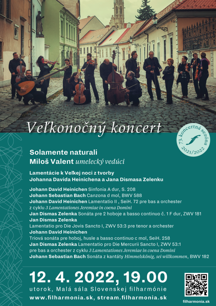 Veľkonočný program, Lamentácie k Veľkej noci uvedie v Malej sále Slovenskej filharmónie súbor pre starú hudbu Solamente naturali. Koncert sa uskutoční v utorok 12. apríla 2022 o 19.00. Súbor pre starú hudbu Solamente naturali s umeleckým vedúcim Milošom Valentom ponúkne program zostavený z diel tr...