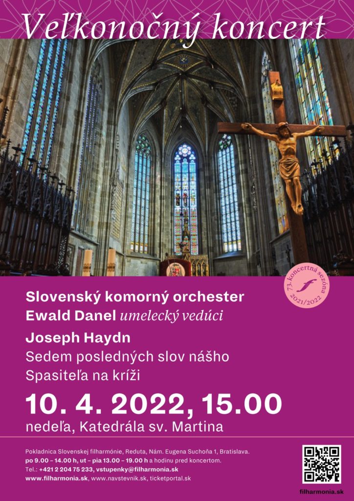 Členovia Slovenského komorného orchestra s umeleckým vedúcim Ewaldom Danelom uvedú aj v 73. sezóne Veľkonočný koncert na Kvetnú nedeľu, 10. apríla 2022. Uskutoční sa v Katedrále sv. Martina o 15.00 v rámci cyklu Hudba v chrámoch. Na programe je dielo Josepha Haydna, ktoré už tradične zaznieva v predveľkonočnom období v Bratislave – Sedem posledných slov nášho Spasiteľa na kríži. Tentokrát to bude jeho orchestrálna verzia.