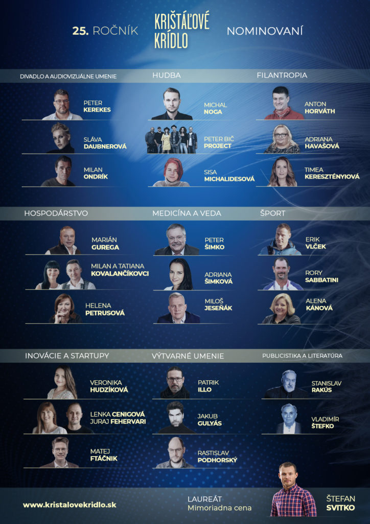 Krištáľové krídlo každoročne oceňuje významné osobnosti Slovenska v oblasti vedy, kultúry, filantropie či športu. Z vyše 140 nominácií za rok 2021, ktoré do odborných diskusií priniesli porotcovia, ale aj široká verejnosť, sa do finálneho výberu v 9 kategóriách dostalo 26 nominácií a jedna Mimoriad...