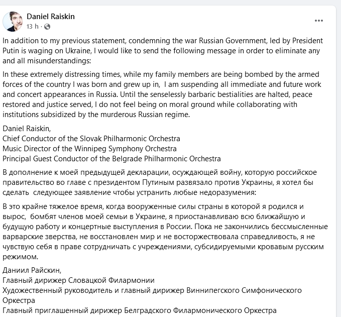 V týchto mimoriadne úzkostných časoch, keď členov mojej rodiny bombarduje armáda krajiny, v ktorej som sa narodil a vyrastal, pozastavujem všetky bezprostredné aj budúce spolupráce a koncertné vystúpenia v Rusku. Pokým sa nezastaví nezmyselne barbarská beštialita, neobnoví mier a spravodlivosti nebude učinené zadosť, nepovažujem za morálne spolupracovať s inštitúciami financovanými vražedným ruským režimom."