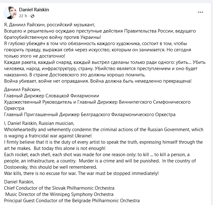 K invázii Ruska na Ukrajinu sa vyjadrujú aj umelci, významné osobnosti, šéfdirigent Slovenskej filharmónie Daniel Raiskin v deň vypuknutia vojny, 24. februára 2022 zmenil dramaturgiu koncertu Slovenskej filharmónie, ktorý dirigoval. Na svojom oficiálnom FB profile v tento deň zverejnil dôrazný, jednoznačný postoj NIE VOJNE a včera reagoval rozsiahlym stanoviskom: „Ja, Daniel Raiskin, ruský hudobník, z celého srdca a dôrazne odsudzujem zločinecké činy ruskej vlády, ktorá vedie bratovražednú vojnu proti Ukrajine!
