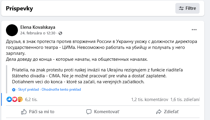 „Nemôžem pracovať pre vraha a brať od neho plat,“ napísala Elena Kovaľskaja na FB. Štátne moskovské divadlo sa riaditeľke poďakovalo za jej odvahu, na sociálnej sieti uviedlo, že udalosti, ktoré sa v súčasnosti odohrávajú, sú v rozpore s jeho poslaním.