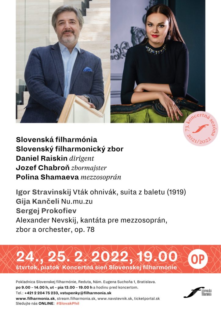 Koncerty Slovenskej filharmónie pokračujú vo štvrtok a piatok 24. a 25. februára 2022. Slovenská filharmónia a Slovenský filharmonický zbor (zbormajster Jozef Chabroň) sa predstavia pod taktovkou šéfdirigenta Daniela Raiskina. Po boku našich telies vystúpi mezzosopranistka Polina Shamaeva. V naštud...