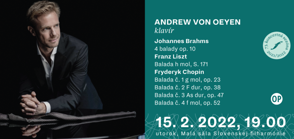 V utorok 15. februára sa uskutoční tretí koncert cyklu Klavír a klaviristi. V Malej sále SF sa predstaví americký klavirista Andrew von Oeyen, ktorý vystúpi v tomto týždni aj po boku orchestra Slovenská filharmónia - vo štvrtok a piatok 17. a 18. Februára 2022. Koncerty sa začnú o 19.00 h. ANDREW...