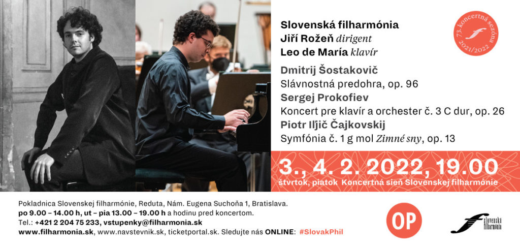 Prvé februárové symfonické koncerty uvedie Slovenská filharmónia vo štvrtok a piatok 3. a 4. februára 2022. Hosťami večerov budú dvaja mladí renomovaní umelci. Rýchlo stúpajúca dirigentská hviezda Jiří Rožeň a španielsky klavirista Leo de María, laureát 10. Medzinárodnej klavírnej súťaže Johanna Ne...
