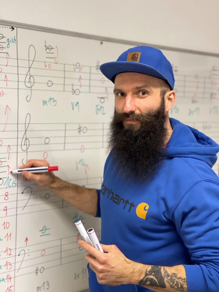 Som primárne basgitarista, i keď mám vyštudovaný kontrabas na konzervatóriu. Preto som sa prirodzene identifikoval s nástrojom, ktorý mi je srdcu najbližší a vyprodukoval som koncept cvičení zameraných na získanie hudobného jazyka práve na ňom. Barman tiež predsa nebude písať príručku o zváraní. Skôr od neho očakávajme návod na chutný a podmanivý večer a ubolené ráno (úsmev). Samozrejme, že sa škola dá aplikovať na hocijaký nástroj. V tom je celá pointa. Každé jedno cvičenie obsahuje noty a tabulatúry v PDF, ale aj odkaz na program Guitar Pro, kde si každý môže navoliť rýchlosť aká mu vyhovuje a dokonca sa tam dá zmeniť aj kľúč a nástroj, takže môžete cvičenia praktizovať aj na drumbli, samozrejme, pokiaľ disponujete prednými zubami nevyhnutnými pre tento nástroj (úsmev). Matematické vzorce sú aplikovateľné na hocijakom melodickom nástroji a pocítim najvyšší stupeň zadosťučinenia, pokiaľ mi niekto pošle spätnú väzbu v štýle, hral som to napríklad na priečnej flaute.