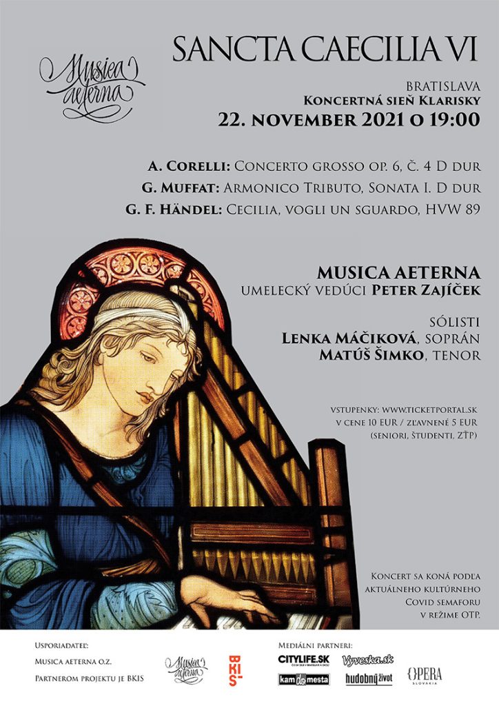 Musica aeterna pod vedením umeleckého vedúceho Petra Zajíčka a sólistami sopranistkou Lenkou Máčikovou a tenoristom Matúšom Šimkom, zaradil na vystúpenie 22. novembra 2021 diela A. Corelliho (1653-1713) Concerto grosso op.6, č.4 D dur, Sonatu I. D dur z Armonico Triboto G. Muffata (1653 - 1704) a Kantátu pre soprán, tenor, sláčiky a basso continuo HWV 89 Cecilia, vogli un sguardo G. F. Händla (1685 - 1759).