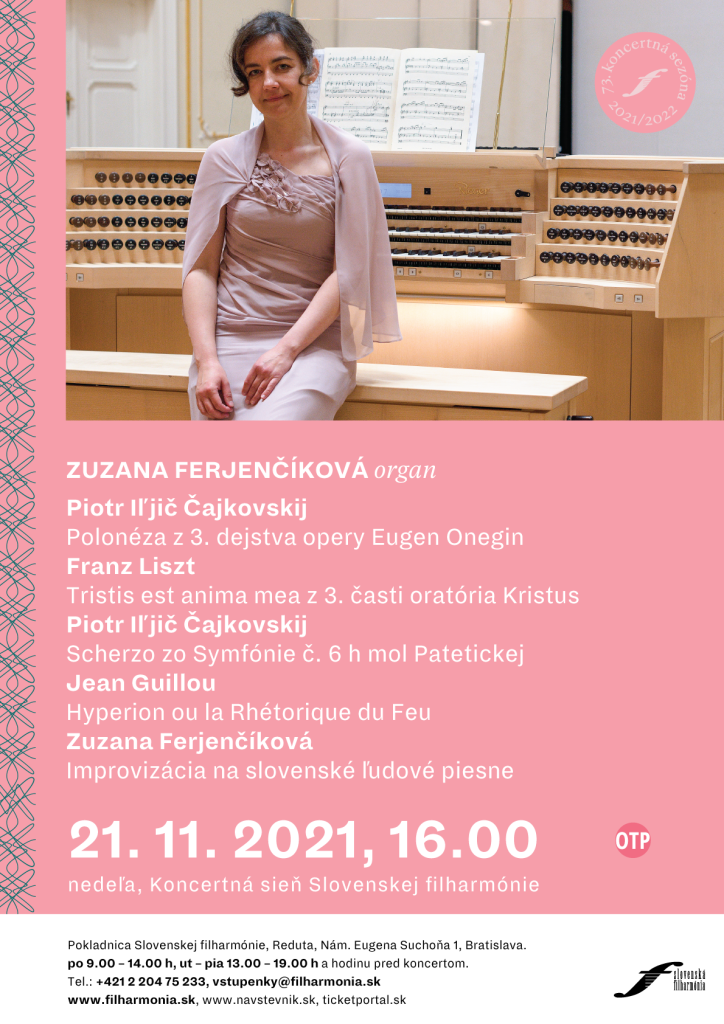 Program koncertu zostavila z viacerých transkripcii známych diel. V Koncertnej sieni zaznie Čajkovského veľkolepá tanečná Polonéza z 3. dejstva opery Eugen Onegin, časť z oratória Kristus Franza Liszta, Sherzo z Čajkovského 6. symfónie, plné živelného temperamentu. Nasledovať bude štvorčasťová skladba Hyperion ou la Rhétorique de Fou op. 45 (Hyperion alebo rétorika ohňa) z roku 1988 jej pedagóga Jeana Guilloua, ktorý patril medzi najvýznamnejších francúzskych organistov, skladateľov a improvizátorov druhej polovice 20. a začiatku 21. storočia. Koncert uzavrie improvizáciami na slovenské ľudové piesne. Zuzana Ferjenčíková je prvou ženou, ktorá vyhrala prestížnu súťaž v organovej improvizácii v holandskom Haarleme (2004). Okrem bohatej koncertnej činnosti je od septembra 2021 profesorkou hry na organe na Codarts University v Rotterdame. Jej pôsobenie zahŕňa široké spektrum aktivít.