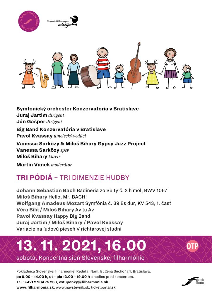„Tri pódiá – tri dimenzie hudby“ – predstavia sa malý „mozartovský“ symfonický orchester, Big Band Konzervatória s umeleckým vedúcim Pavlom Kavassayom a Vanessa Sarközy & Miloš Bihary Gypsy Jazz Project. Znieť bude klasická hudba, jazz a world music. Všetko v interpretácii mladých zanietených hudobníkov, budúcich profesionálov. V sobotu sa najmenší návštevníci zoznámia s rôznymi žánrami hudby. A určite zažijú v Koncertnej sieni veľa zábavy. Koncert sa skončí obľúbenou tombolou s peknými cenami.