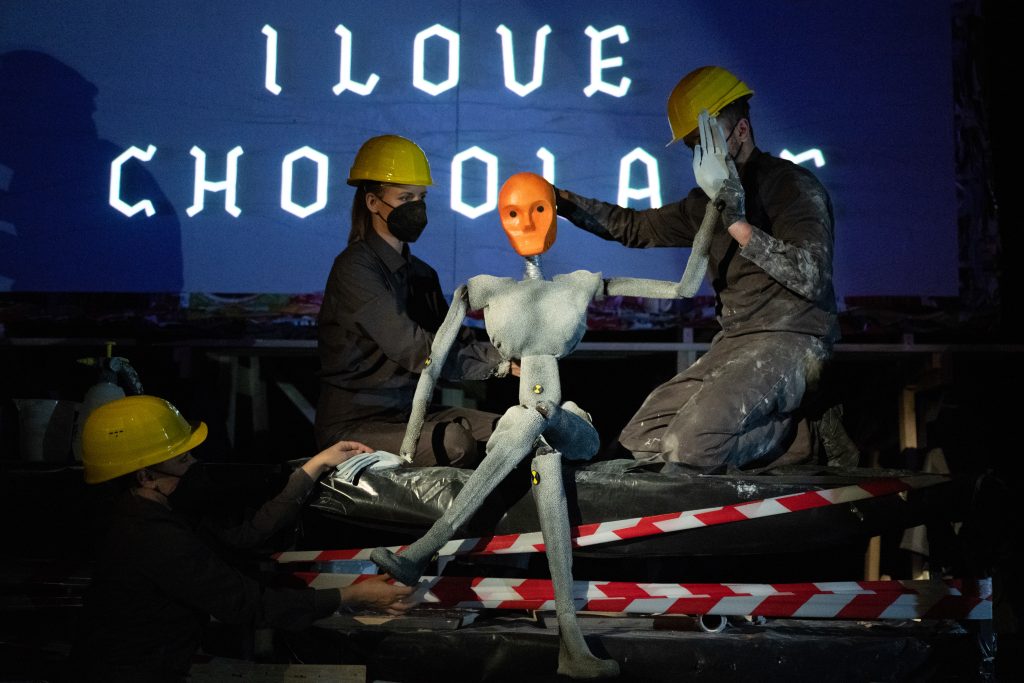 Herci (Barbora Palčíková, Alena Pajtinková, Nadežda Vladařová, Matej Babej, Tomáš Mischura, Daniel Žulčák) a hudobníci (Matej Urban, Marián Frkáň) navlečení v skafandroch a rúškach sú stavební experimentátori a zároveň robotníci divadla, zaprášení od materiálu, s ktorým na javisku pracujú. Laboratórium sa postupne mení na stavenisko. Objavujú sa v ňom a okrem nakreslených vlásočníc cesty na podlahe javiska, aj artefakt miešačky s ľudovým motívom.