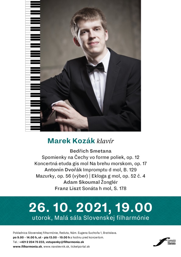 Marek Kozák ponúkne návštevníkom prierez romantickou klavírnou literatúrou z pera troch autorov s originálnym skladateľským štýlom - Bedřicha Smetanu, Antonína Dvořáka a Franza Liszta. Protiváhou legendárnej Lisztovej Sonáty h mol budú v programe diela českých autorov, aj výber z diel Antonína Dvořáka, ktorého klavírnu tvorbu svet objavil až t. r. pri príležitosti 180. výročia jeho narodenia. Program doplní skladba Žonglér výrazného českého klaviristu, skladateľa a pedagóga Adama Skoumala.