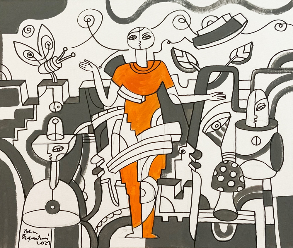 Pozrime sa teraz bližšie na aktuálne prezentovanú výstavu v priestoroch Bratislavského hradu. Bratislavčanka, donedávna sa pohybujúca na komerčnom zahraničnom trhu, urobila jedno zo svojich umeleckých rozhodnutí a „vrátila“ sa k fenoménu výtvarného prejavu, ktorým je klasická maľba. Zatiaľ čo komerčná objednávka klienta presne definuje názor, produkt, alebo cieľovú skupinu, voľná tvorba prirodzene poskytuje priestor na vlastnú fantáziu, resp. svojvoľný výber tém. Pre Petru Štefankovú je to často mesto, urbánne prostredie charakteristických budov konkrétneho miesta, ktoré vieme identifikovať (občas aj nevieme), alebo zdanlivo realistické (hoci vskutku imaginárne) akoby fabrické výjavy industriálnej periférie až kým nezistíme, že ide vesmír - ten okolo nás, aj v našej hlave. V „podpalubí“ vzdialených myšlienok strieda históriu so súčasnosťou, starovek s modernou. Kontrastne k civilizáciám a atmosfére i nálade mesta (veľmi často dokonca i interiéru domu či bytu s dôrazom na intimitu chvíle jednotlivca), sa objavujú v jej tvorbe aj fragmenty prírody. Nie sú to len kvety a stromy, ale aj ryby a vtáci, ergo florálne a zoomorfné prvky – symbolické detaily (možno aj biblických motívov ?!) ťahané kdesi z podvedomia, alebo architektonické prvky starovekých kultúr siahajúcich k prapočiatku existencie ľudstva, kultúry a umenia. Mimoriadne častým motívom je však žena - figúra v centre plochy obrazu, ale aj v centre diania príbehu, situácie, momentu. Žena moderná, súčasná, ale aj mýtická i mystická, žena znaková a symbolická, buď jednoznačne sebavedome zadefinovaná, alebo naopak „zakódovaná“ v pavučine čiar. Napokon i žena (vo výtvarnom prevedení aj v charaktere) ornamentálna ako ozdoba či klenot. Zväčša sama - vo svojej elegancii aj sile - ako dôkaz večnej femínnej prítomnosti a energie.