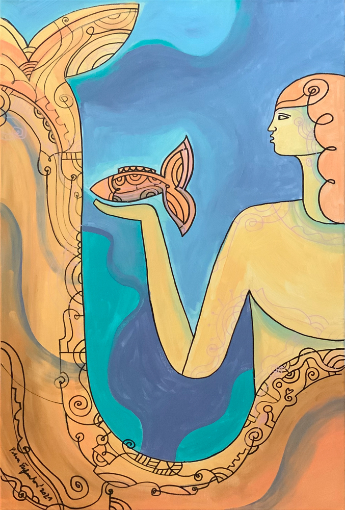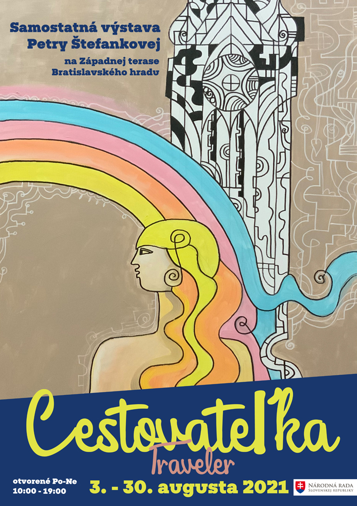 Výstava na západnej terase Bratislavského hradu poskytuje pohľad na najnovšie maliarske výstupy ostatných troch rokov. Je možné ju prirodzene vnímať ako komplex (sériu) obrazov, napriek tomu sú evidentné jednotlivé cykly, ktoré majú svoje špecifiká, vizuálne odlišnosti a výtvarné prístupy. Na súčasnej výstave dominuje farba, ktorá však kontrastne rezonuje s plochami dvojice výraznej čiernobielej kombinácie (Lady with Dog, Black and White Tree). Do monochrómu vstúpi farba spočiatku opatrne v pastelovej figúre v centre obrazu (Urban Life, Human and Robots, Yellow Bubble). Tzv. „zrkadlenie“ sa objaví v občasných výjavoch (Mirroring, Reflection of the Past), ojedinelý je čistý farebný horizont bez štylizovaného ornamentu, resp. „ornamentom“ sa stáva dominujúca figúra (Loneliness, Mermaid, Couple, Animal Woman, Woman with long Hair). Abstrakcia versus dekoratívnosť zarezonuje vo farebne odlíšených kruhoch v ploche (Flowers I, Flowers II), dekoratívnosť plná „grafických“ detailov odznie v sérii diel (Abstract, Silhouette, Tree Women, Vanilla Mood), s výsostne maliarskym pozadím, kde je asi najviac priznaný štetec (Spring Light, Rays of Light). Historizujúce prvky, symboly a novú „secesiu“ zautomatizovanej „pokrčenej“ linky reprezentujú obrazy (Woman - Tree, Woman with Mask, Animal Woman, Sea Fairy, Mother and Child, Fashion Icon, Petra as a Rock). V týchto okruhoch tém, výjavov a odkazov sledujeme pastelové tóny, krehký kolor, ktorý vyvažuje niekedy jemná inokedy razantnejšia čierna linka. Autorka v nich akrylom a pozorovaním života „formuje“ súčasné aj minulé svety. Paradoxne sýta farebnosť, plná - prvkami „zaprataná“ plocha, výrazná figúra, fragmentálna architektúra, ale predovšetkým pôsobivá a odvážna razancia maliarskeho gesta rezonuje vo sviežej kolekcii malieb (Tea at Five, Games of Life, Thinking Figure), krátke odkazy na ženu s atribútmi, kde už je maľba mäkšia, voľnejšia a slobodne veľkorysá (Woman with a Pipe, Woman with a Bird, Woman with a Candle), alebo tajomné hĺbky vôd ako signály na vzdialené oceány, či fantazijné rozprávky (Underwater, Aquabellas in the Sea, Alice and Whale, Hot Chicken). Výtvarníčka, hoci si (možno aj podvedome) „požičiava“ vo svojej tvorbe symbolické skratky z minulosti, znak sa stáva (v grafike aj maľbe) jej výpovednou hodnotou a prostriedkom, čiara definuje základnú informáciu, linka určuje smer jej reality aj emócie. Emócia je zašifrovaná, informácia má prím. Jej diela, v ktorých treba hľadať indície, evokujú zároveň akýsi malý „billboard“, za ktorým sa máme obzrieť aj cez okno električky. Svojou originalitou zaujmú (hovorovo povedané) na „prvú signálnu“.
