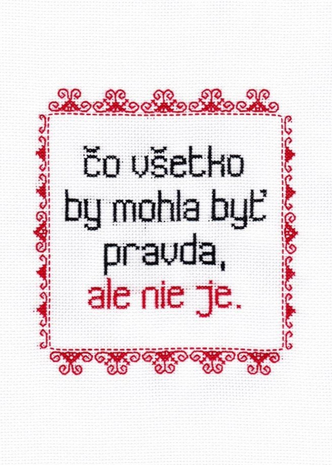Výstavu uvádza výšivka aktivistickej skupiny Kundy Crew, ktorá inšpirovala aj názov výstavy Potulnej Galérie Čo všetko by mohla byť pravda, ale nie je.