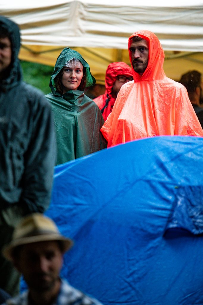 A to, na čo sme všetci počas celého dusného doobedia tak úpenlivo čakali, aj skutočne prišlo. V podstate to už k festivalu automaticky patrí a nemo, spýtavo to bolo v očiach každého z nás: kedy bude na festivale pršať? Na Slovenské alternatívne leto nikto predsa nechodí bez pršiplášťa, bez gumákov a všetci počítajú s tým, že sa bude tancovať v daždi a blate. Dážď prišiel a v plnej kráse, na chvíľu síce počas svojej najväčšej intenzity prerušil festivalové dianie, ale vystúpenie skupiny Modré hory už sa mohlo uskutočniť a bolo o čosi romantickejšie. A mimochodom, s perfektným nazvučením.