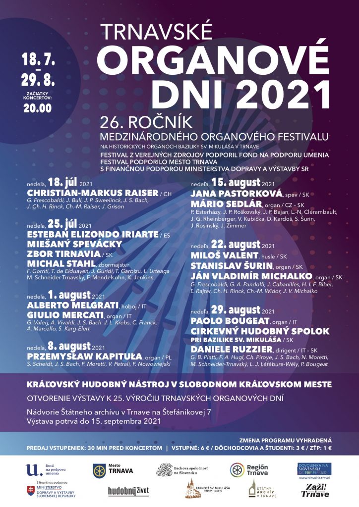 „Záverečný koncert Trnavských organových dní, ktorý sa uskutoční 29. augusta, bude patriť vystúpeniu Cirkevno-hudobného spolku pri Bazilike sv. Mikuláša spolu s organistom Paolom Bougeatom z Talianska. Aj tento rok sa na festivale predstaví špička hudobnej organovej scény, za čo sme v súčasnej situácii veľmi vďační," hovorí organizátor festivalu Stanislav Šurin.