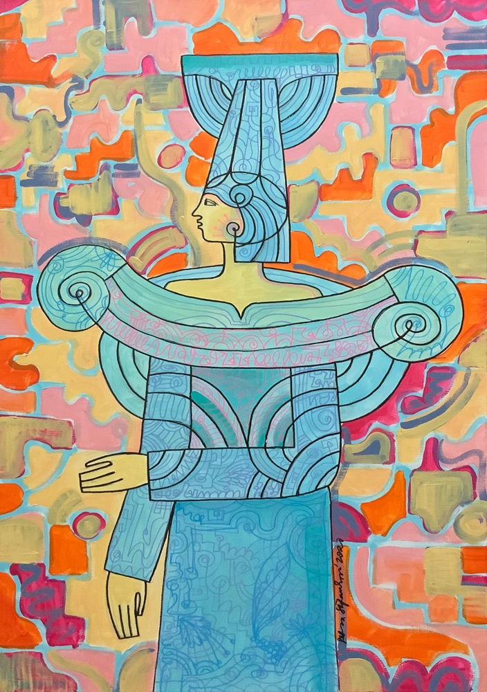 PŠ: Centrom mojej pozornosti je vždy človek v rôznych životných situáciách a abstraktných prostrediach. Najčastejšie pracujem so symbolom ženskej figúry či s portrétom. Zaujíma ma vplyv grafického dizajnu, komiksu, pop kultúry a súčasnej módy v maľbe. Keďže často používam ako autorský rukopis aj abstraktný kaligrafický ornament čiernou linkou akrylovým markerom, tento proces je niekde na hranici kreslenia a písania. Namiesto typografie a písma si však kreslím alebo „píšem“ tváričky postavičiek a rôzne štruktúry. Tejto téme abstraktnej kaligrafie som venovala aj celý zápisník alebo denník. Sú v ňom záznamy denných zážitkov a emócií, ale text v ňom žiaden nenájdete. Slovo v tomto prípade pre mňa vôbec nie je dôležité a aj napriek tomu má štruktúra v obraze výpovednú hodnotu.