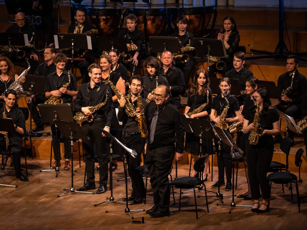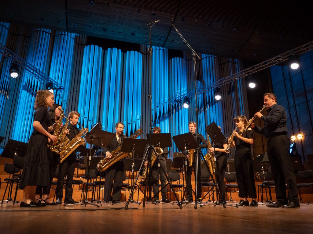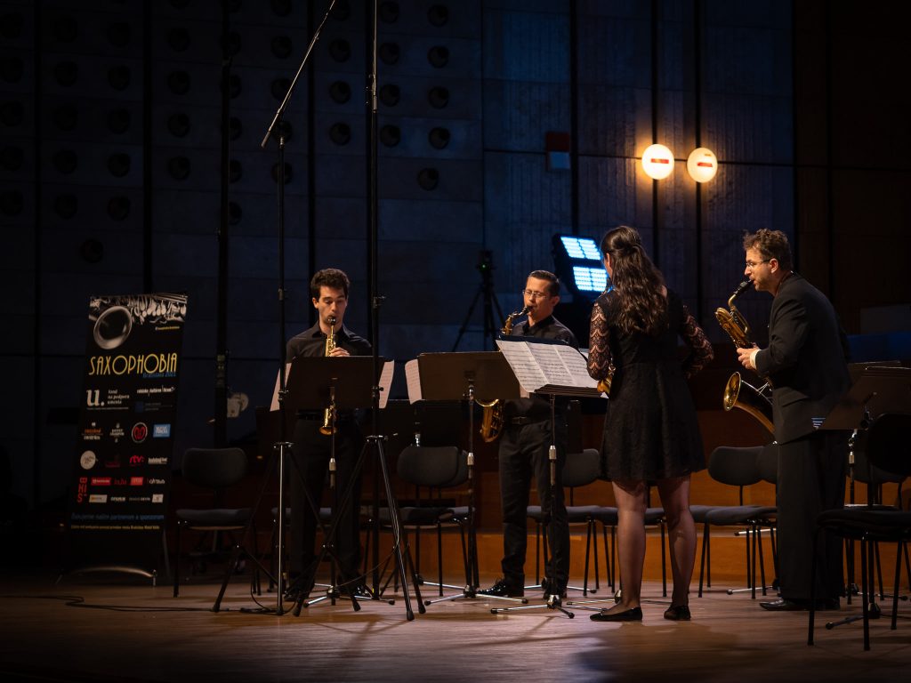 Začali Šostakovičovou Polkou z baletu Zlatá doba op. 22, skladbou náročnou nielen na rytmickú súhru, no najmä na výraz. Dosiahnuť v Šostakovičových dielach to, čo je preňho typické – humor spojený s jeho charakteristickým sarkazmom, si naozaj vyžaduje kumšt, nadhľad, technickú vyspelosť a vedomosť. V aranžmáne Jacquesa Laroque sa dobre vynímal sopránsaxofón (Neja Anderle), z dvojice tenorov dominoval Vid Verdinek, zostavu dopĺňal ďalší tenor, dve altky a ďalšie dva barytóny. Aj v Piazzollovom Le grand tango pre violončelo a klavír sa im podarilo dobre zorientovať v náročnej rytmike a priblížiť k výrazu. Tému uvádza Astor až po rytmicky dravom intre a je, ako to už uňho býva zvykom, mimoriadne dynamicky variabilná. Hráči tieto odtiene dokázali dostať do interpretácie – nositeľmi tém boli spravidla okrajoví muzikanti telesa, tenor a sopránsaxofonistka.