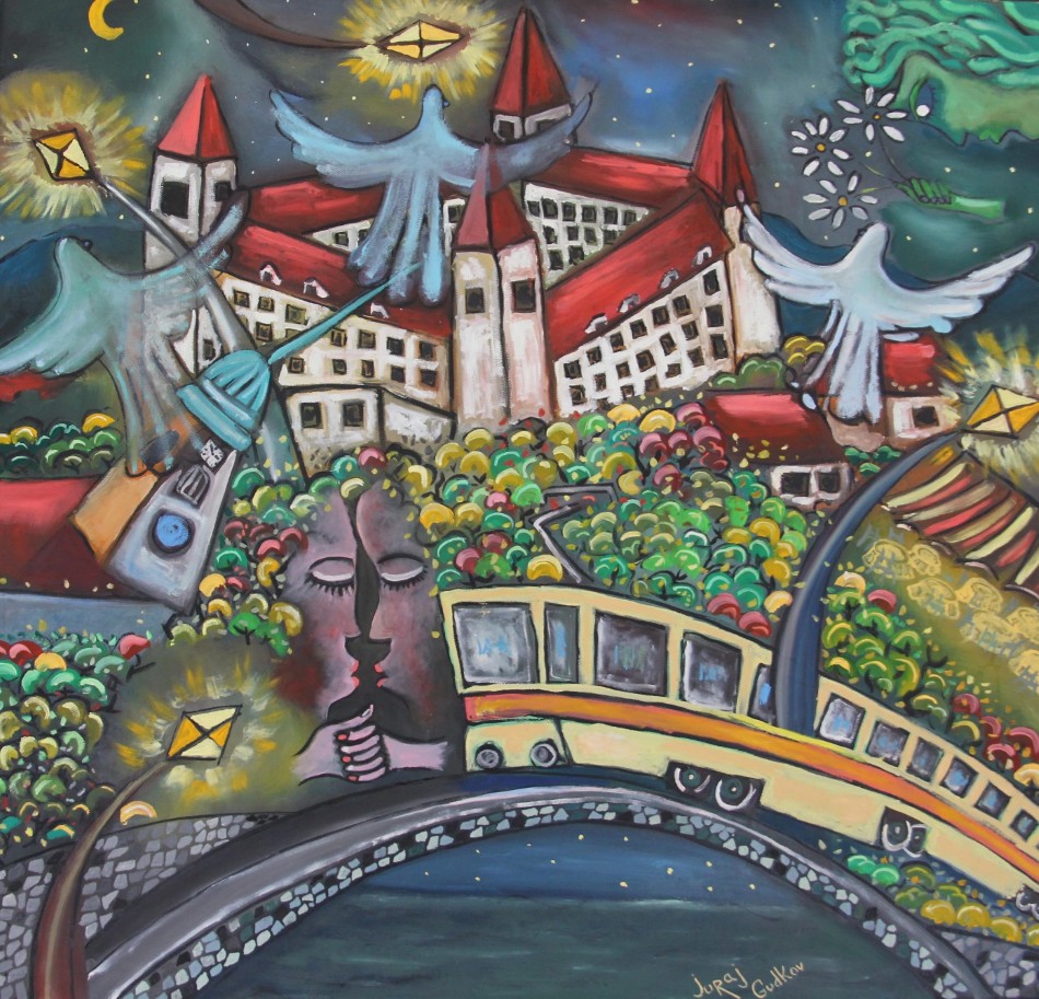Maliar Yuri Gudkov vstupuje na slovenskú výtvarnú scénu autorskou výstavou v Ružinovskej galérii, kde prezentuje sériu osemnástich obrazov z posledného desaťročia. Predstavuje sa ako figuralista i krajinár reagujúci na realitu dneška, maľuje pohodové chvíle človeka i rodiny, ale okrajovo sa dotýka i vážnejších tém ľudskej existencie a krehkej hranice, ktorá rozdeľuje vojnu a mier. V jeho obrazoch nachádzame úsmevné životné príbehy, bizarné ľudské postavy, ale i mnohé symboly a inotaje, ktoré nútia k zamysleniu.