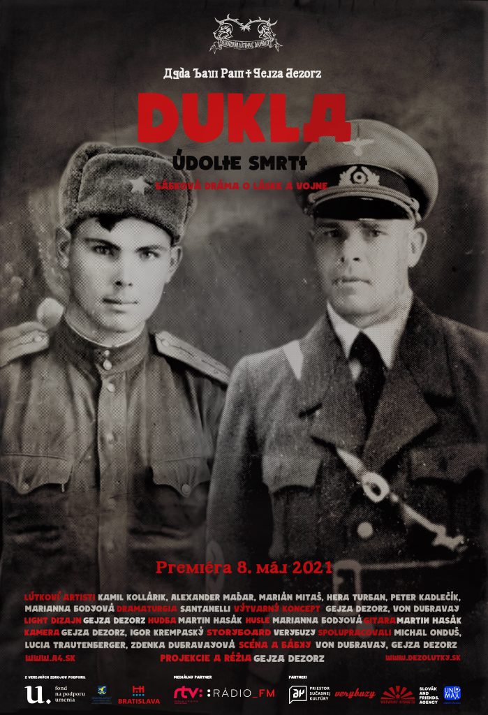 Témy vojny a nenávisti, ale aj bezbrehej lásky otvára v netradičnom novom spracovaní aj najnovšia epická bábková dráma DUKLA, údolie smrti v podaní Dezorzovho lútkového divadla z dielne osvedčenej autorskej dvojice Gejza Dezorz a Agda Bavi Pain. Po štyroch rokoch od svojej poslednej premiéry kultovej klasiky Kráľ Ubu tak na divadelné dosky prináša základné otázky o pôvode zla či príčinách intolerancie. Príbeh rómskeho mladíka a nemeckého dôstojníka, ktorý sa odohráva na pozadí historických udalostí v horthyovských Košiciach a počas krvavých bojov o Dukliansky priesmyk, predstavuje nerovný milenecký vzťah mužov stojacich nielen na dvoch opačných barikádach, ale aj koncoch spoločenského rebríčka. Ich postupné zblíženie a vnútorný prerod ústia nezvratne do tragického finále spolu s celou vojnovou mašinériou aj zvrátenou morálkou sociálnych bublín, ktoré môžu byť prudko výbušné najmä v časoch krízy či prírodnej kataklizmy. Napokon, sami dnes môžeme sledovať nielen v online prostredí doslova masakre, ktoré sa neštítia glorifikovať zločinecké režimy a podnecovať k násiliu v mene pokrivených predstáv o slobode či spravodlivosti. A tak sa krutá vojnová skúsenosť spred takmer 80 rokov v súčasnosti opäť vynára na povrch v celej svojej naliehavosti, aby nám pripomenula, kde sú hranice lásky a nenávisti, no najmä ľudskej existencie a morálky.