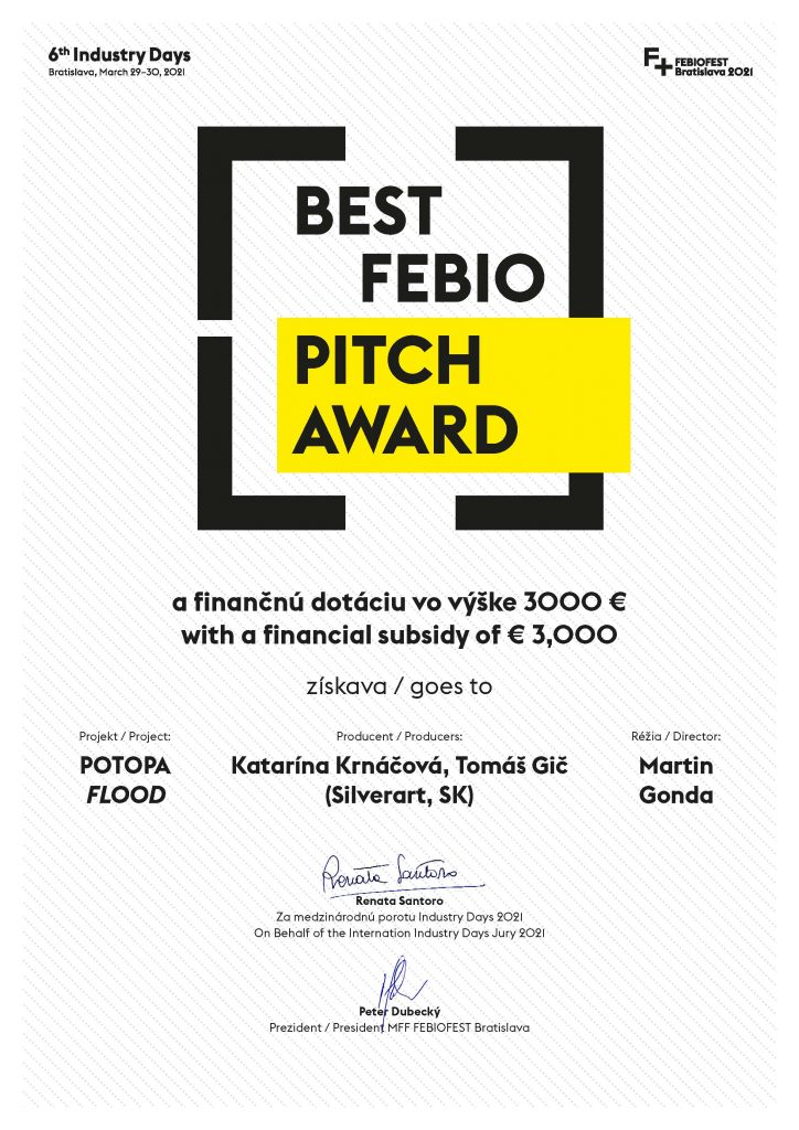 Ocenenie za najlepší prezentovaný projekt - Cenu Best Febio Pitch s finančnou prémiou 3000 eur získal pripravovaný celovečerný hraný debut režiséra Martina Gondu Potopa.