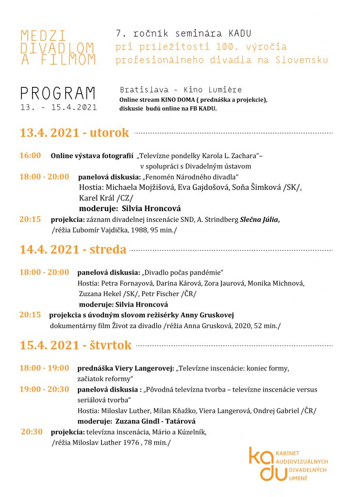 Trojdňový seminár Kabinetu audiovizuálnych divadelných umení (KADU) ponúkne 13.-15. apríla 2021 všetkým priaznivcom divadla a filmu na Slovensku, aj v Čechách, projekcie, inšpiratívne diskusie a prednášky renomovaných odborníkov. 7. ročník s témou ,,Medzi divadlom a filmom” bol z dôvodu pandémie presunutý z októbra 2020 na apríl 2021. Program bude prebiehať online a účasť verejnosti je zdarma.