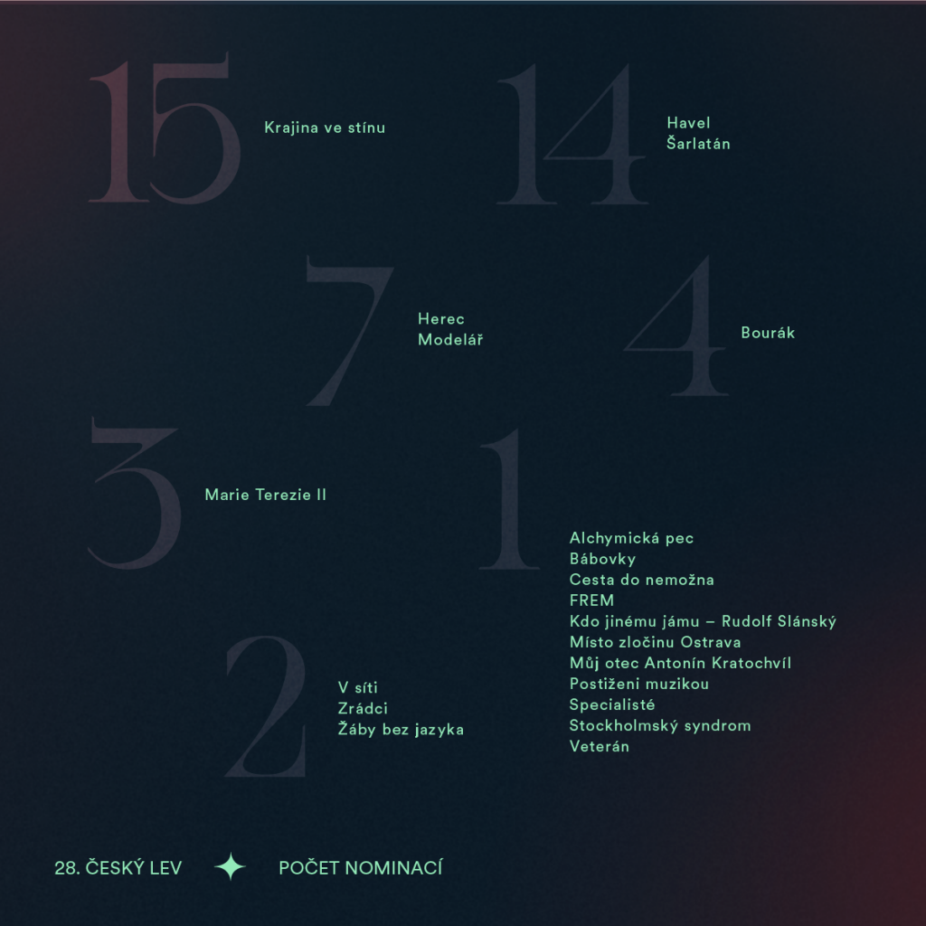 Po minuloročnom úspechu drámy Václava Marhoula Pomaľované vtáča, ktorá doslova ovládla celý 27. ročník, majú tento rok šancu najväčšiu šancu získať prestížne ocenenie snímky Krajina ve stínu (15 nominácii), Havel (14) a Šarlatán (14). Za zmienku určite stojí aj sedem nominácii televíznej mini série Petra Bebjaka Herec a filmu Petra Zelenku Modelář. O nomináciách, ktoré boli zverejnené 18. januára, rozhodovalo 190 členov ČFTA z celkového počtu 325. Tí vyberali nominovaných spomedzi 87 hraných, dokumentárnych, animovaných a krátkych filmov a televíznych diel. O sošku Českého lva sa v 19 štatutárnych kategóriách bude uchádzať celkovo 27 titulov.